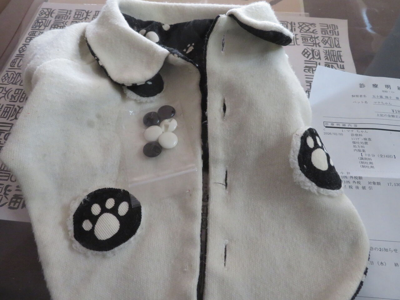 今朝マナが約1週間ぶりにボタンを一個吐きました。