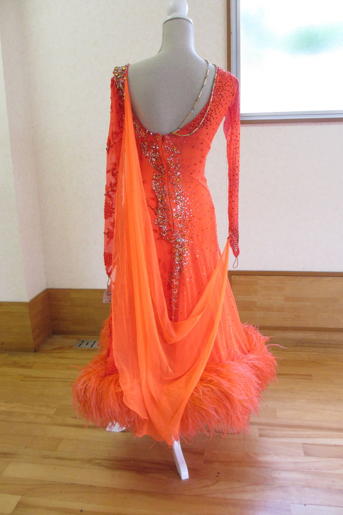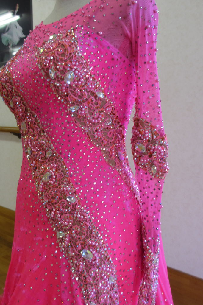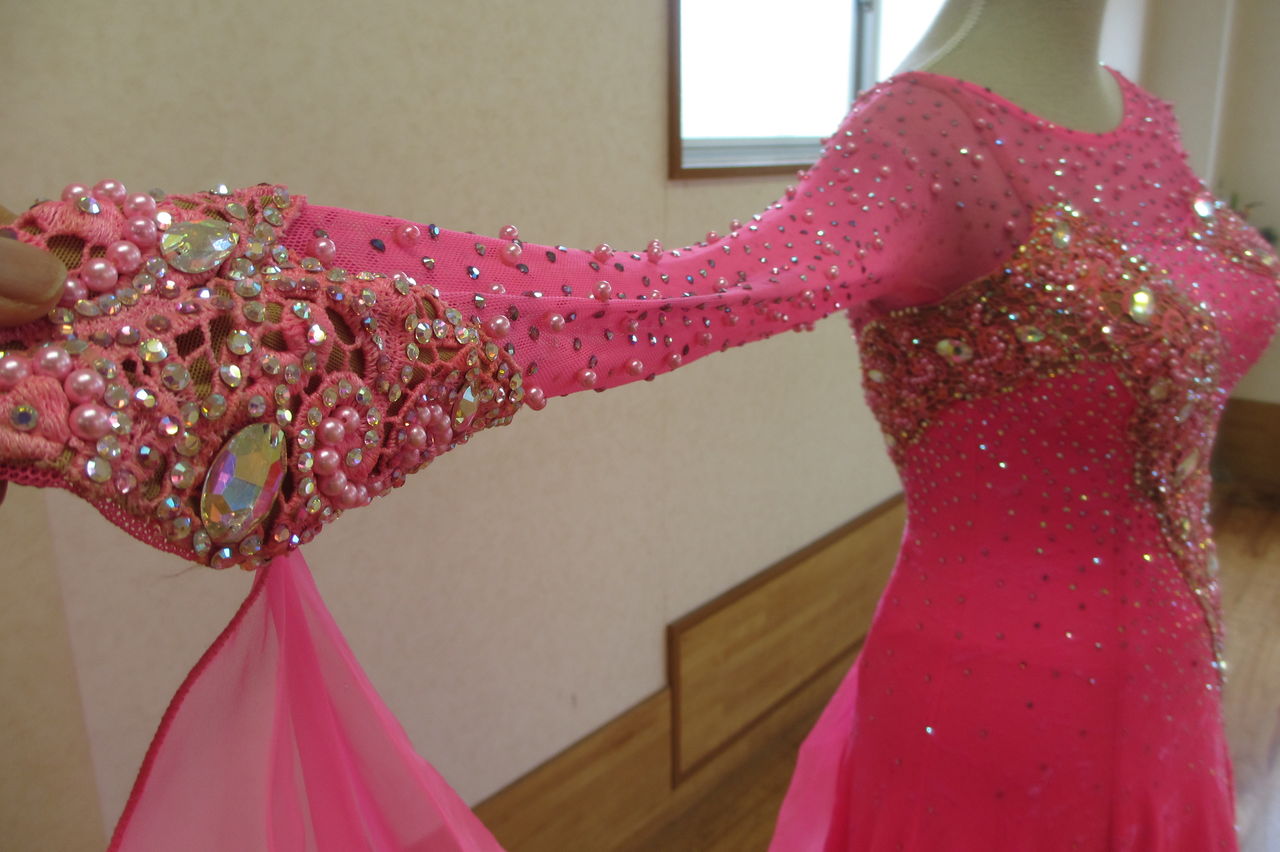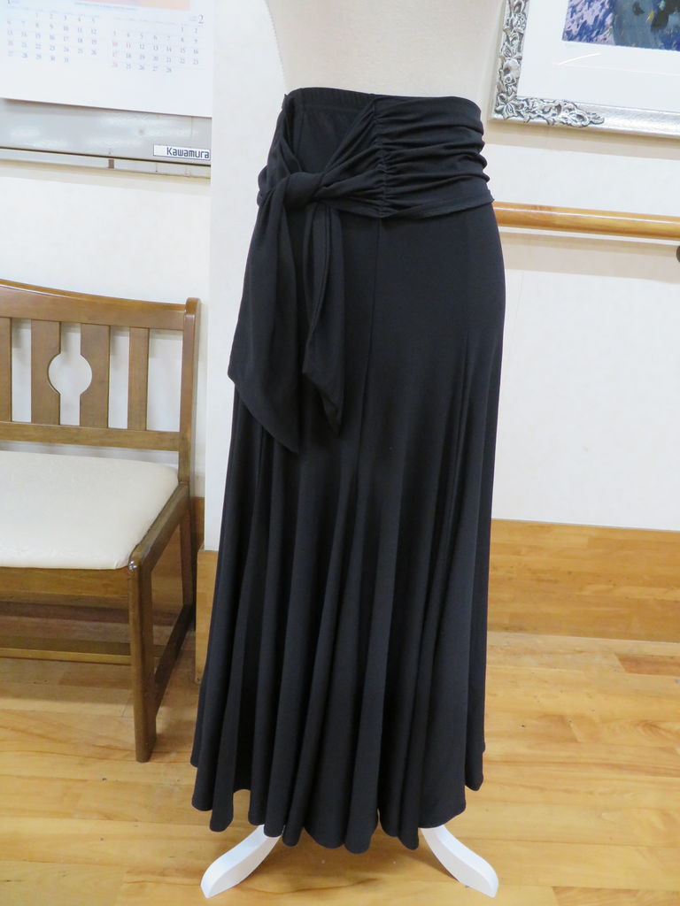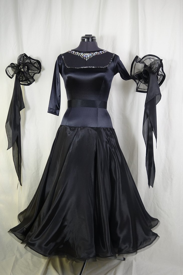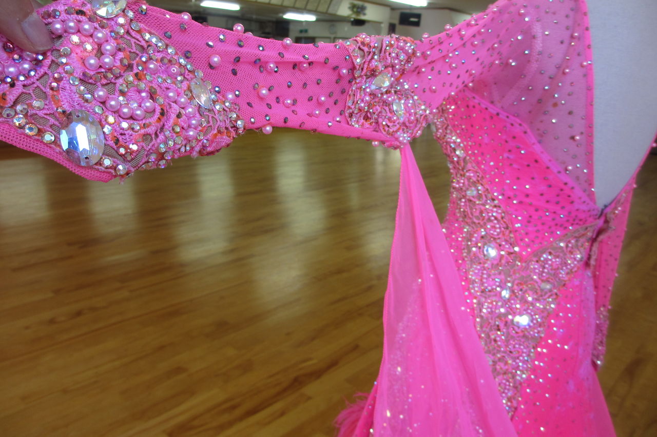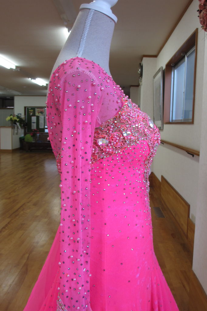 袖は腕が気になる方にも合わせたエレガントな印象のデザインです。上半身はベルベットの生地、スカートはサテンのような光沢の生地。スカートの部分がとてもよく踊ります。