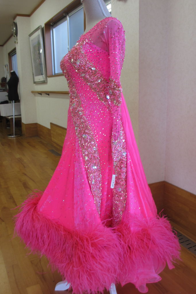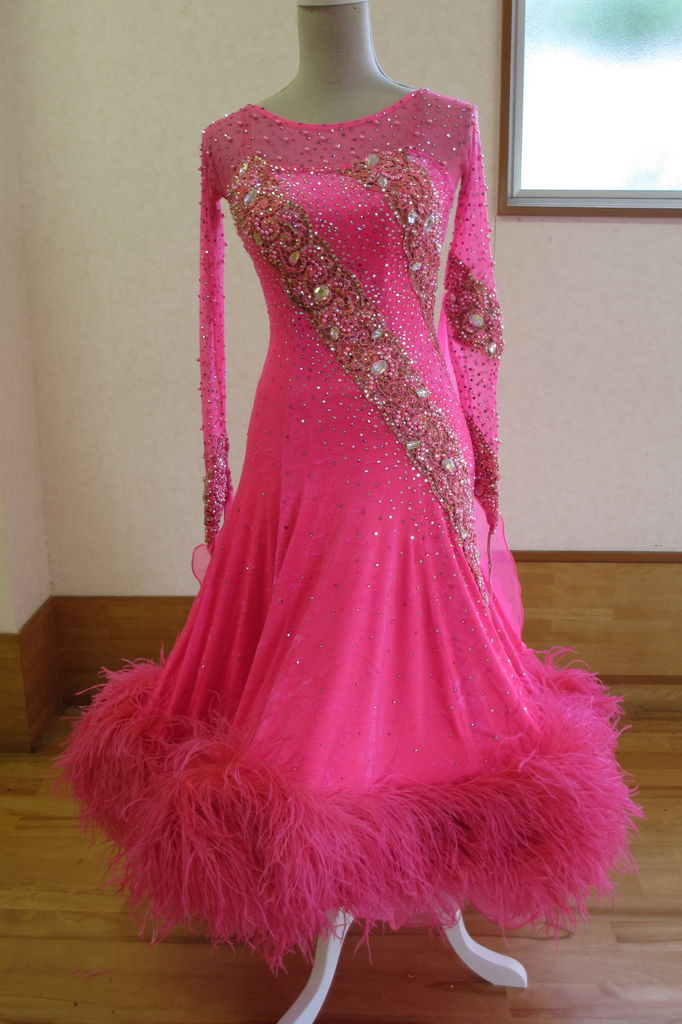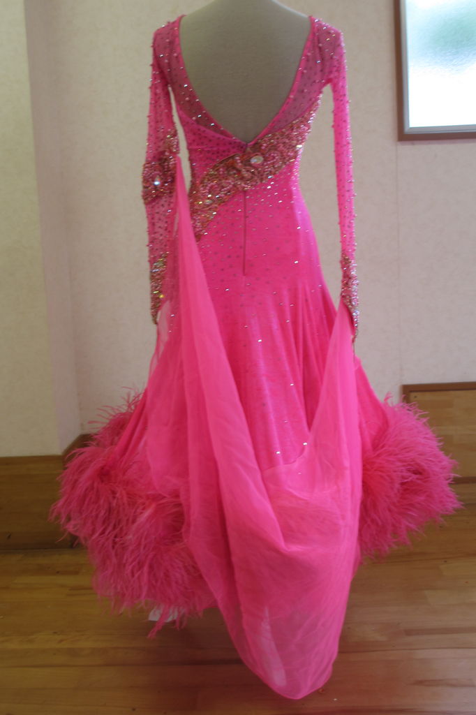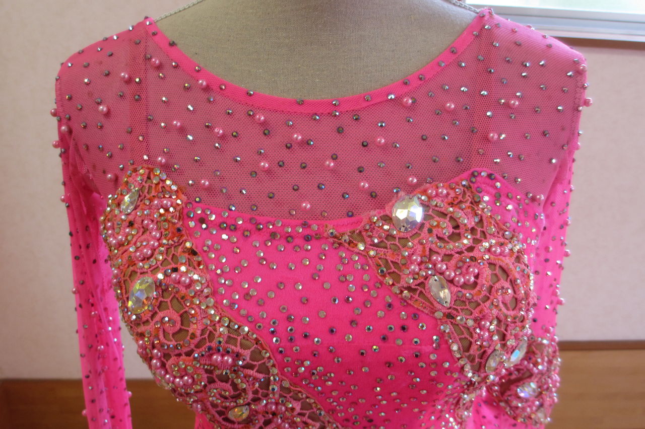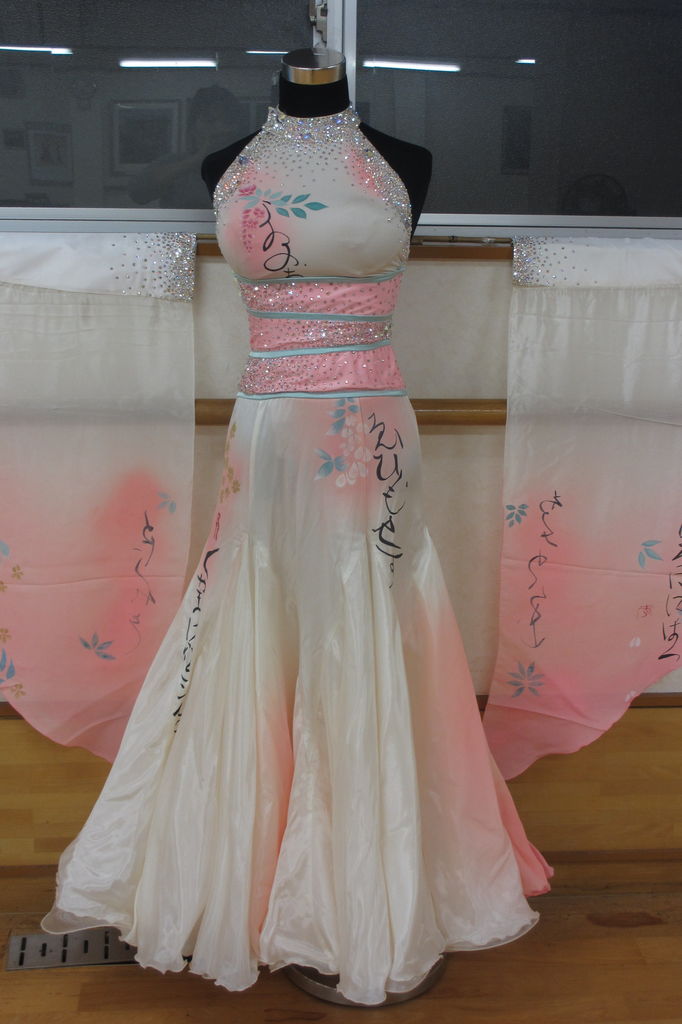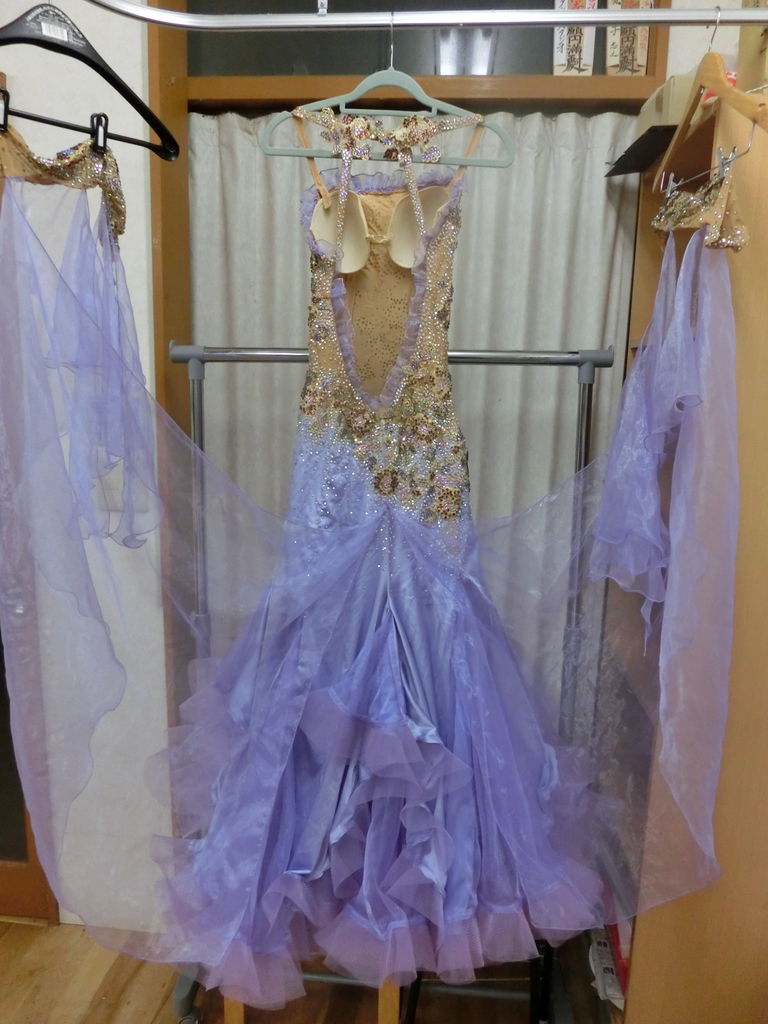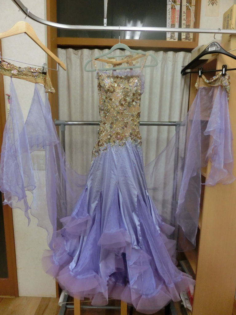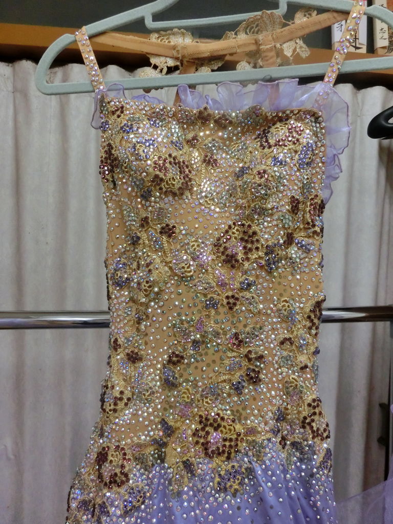 袖は腕が気になる方にも合わせたエレガントな印象のデザインです。上半身はベルベットの生地、スカートはサテンのような光沢の生地。スカートの部分がとてもよく踊ります。