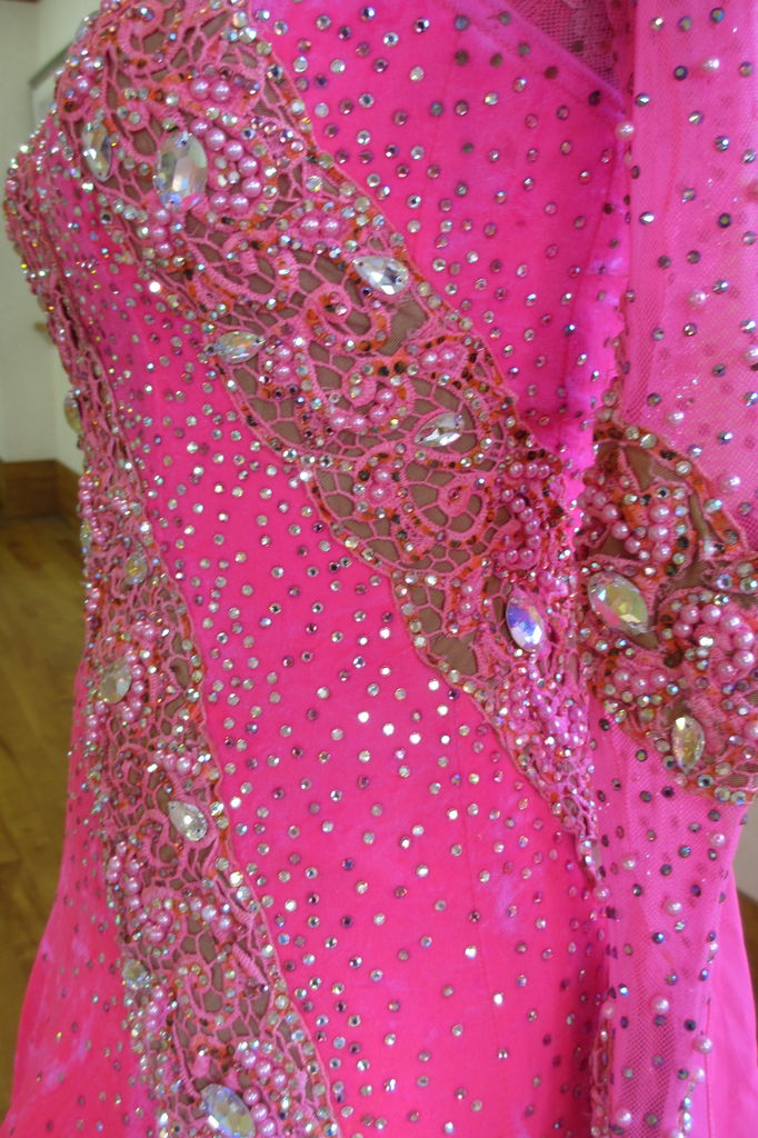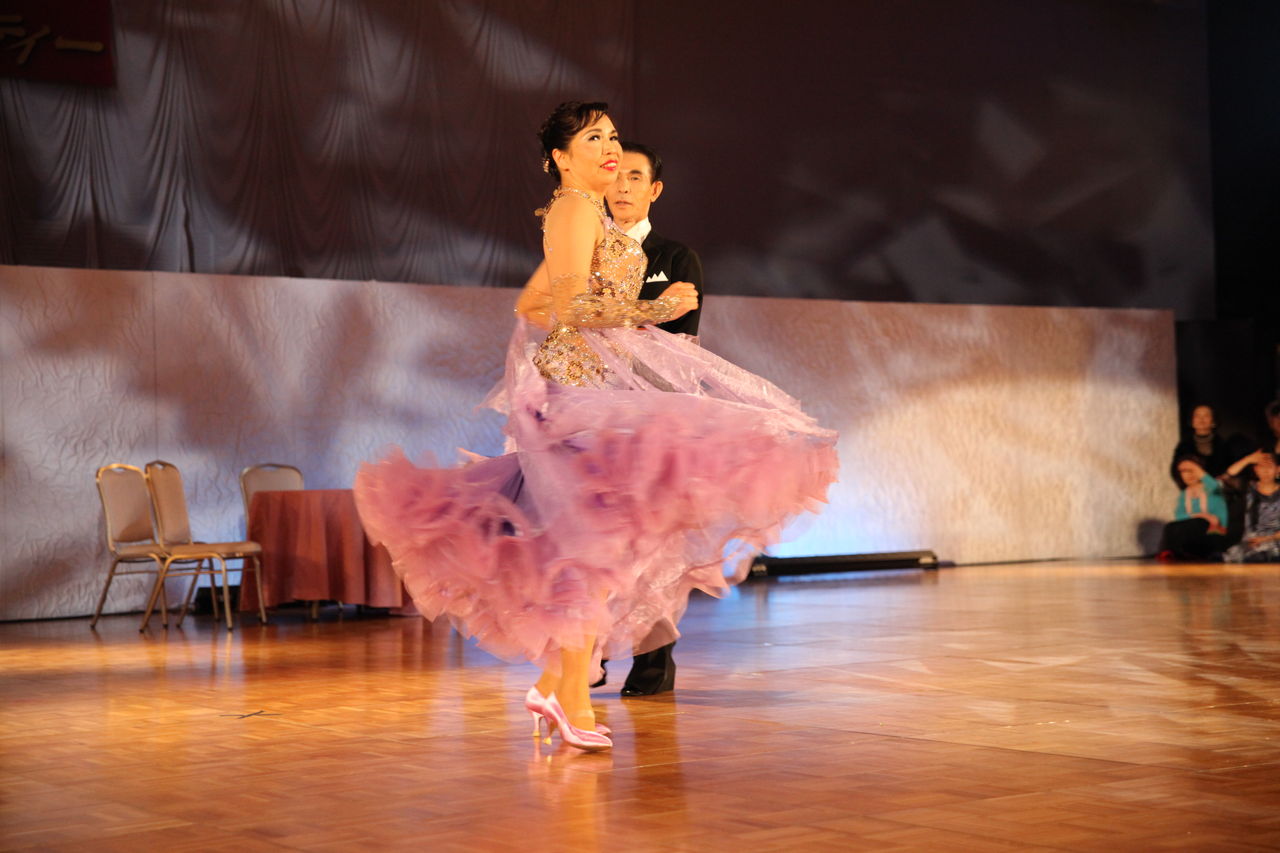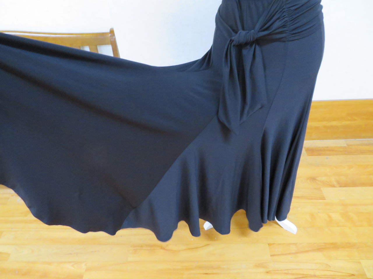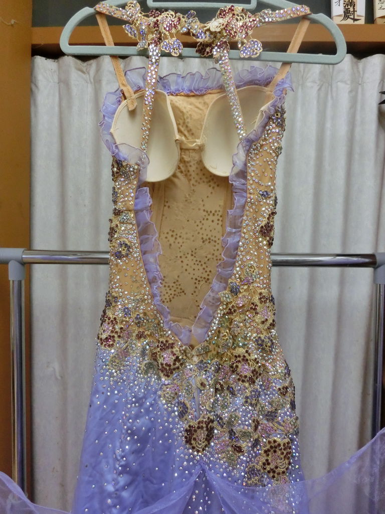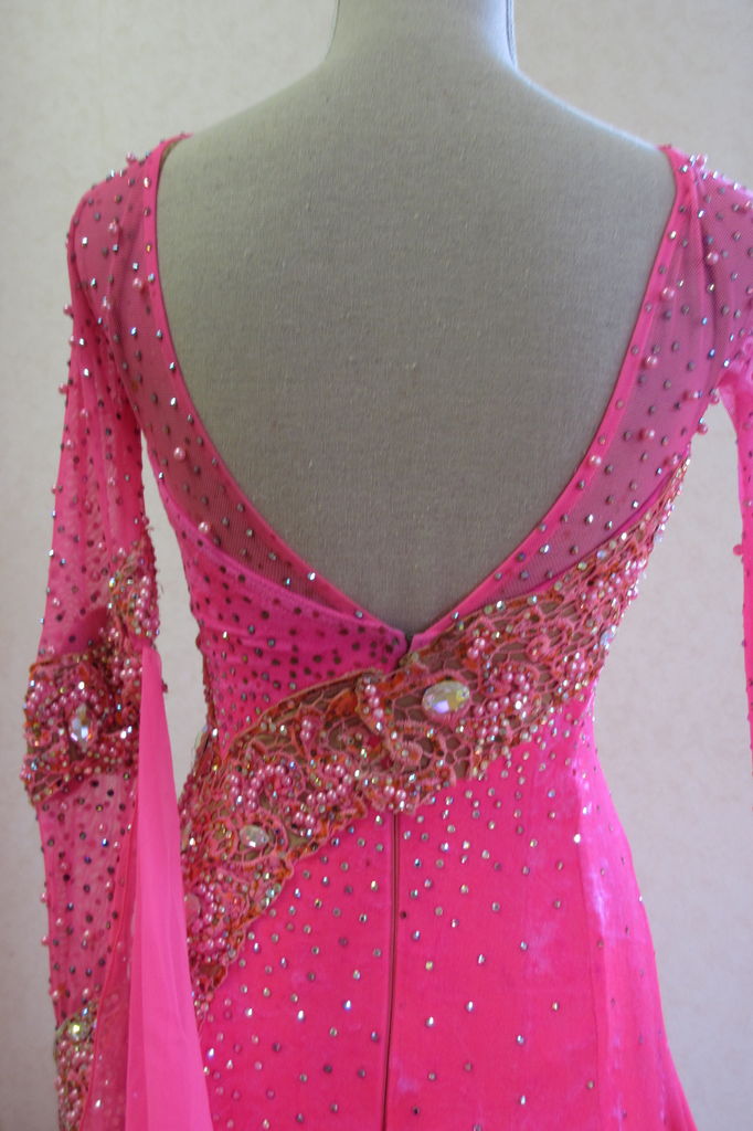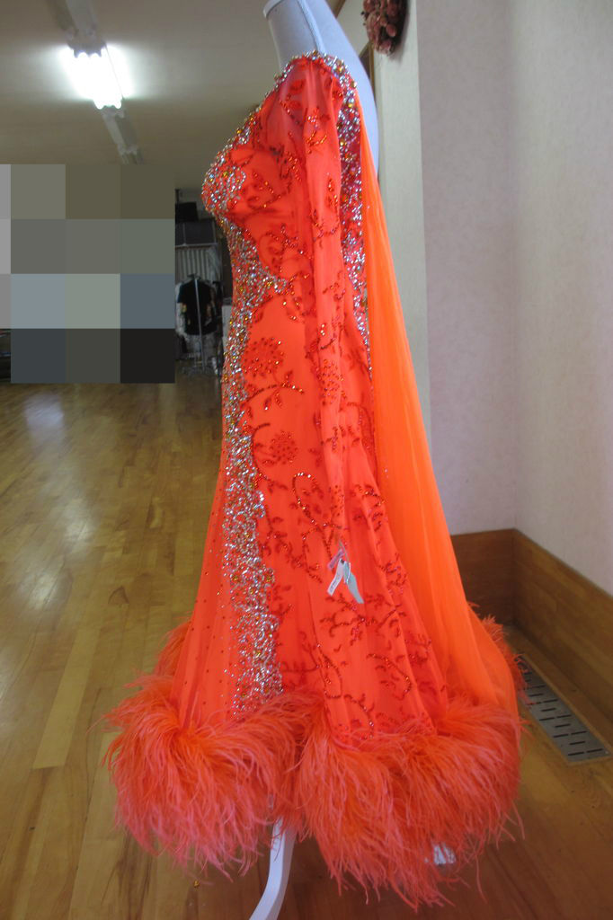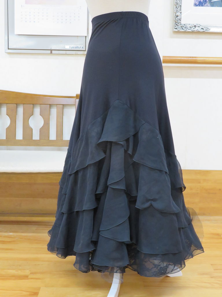袖は腕が気になる方にも合わせたエレガントな印象のデザインです。上半身はベルベットの生地、スカートはサテンのような光沢の生地。スカートの部分がとてもよく踊ります。