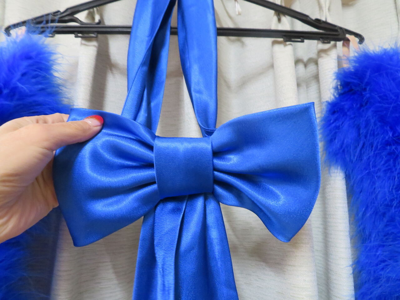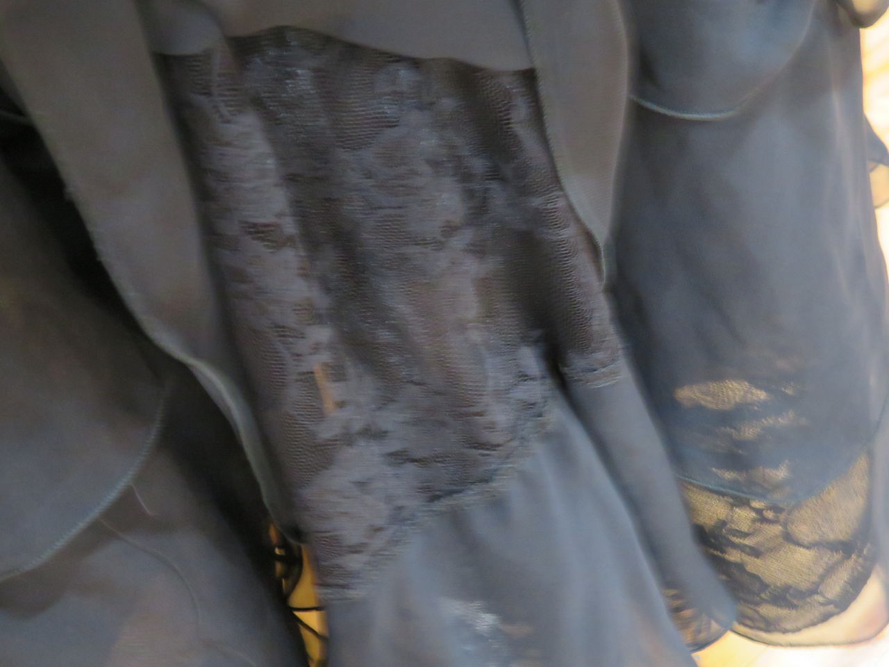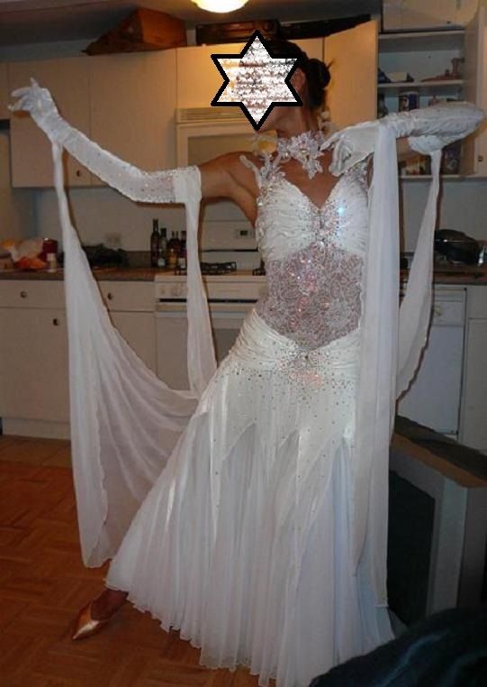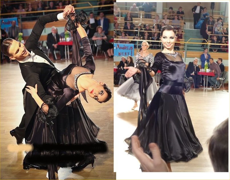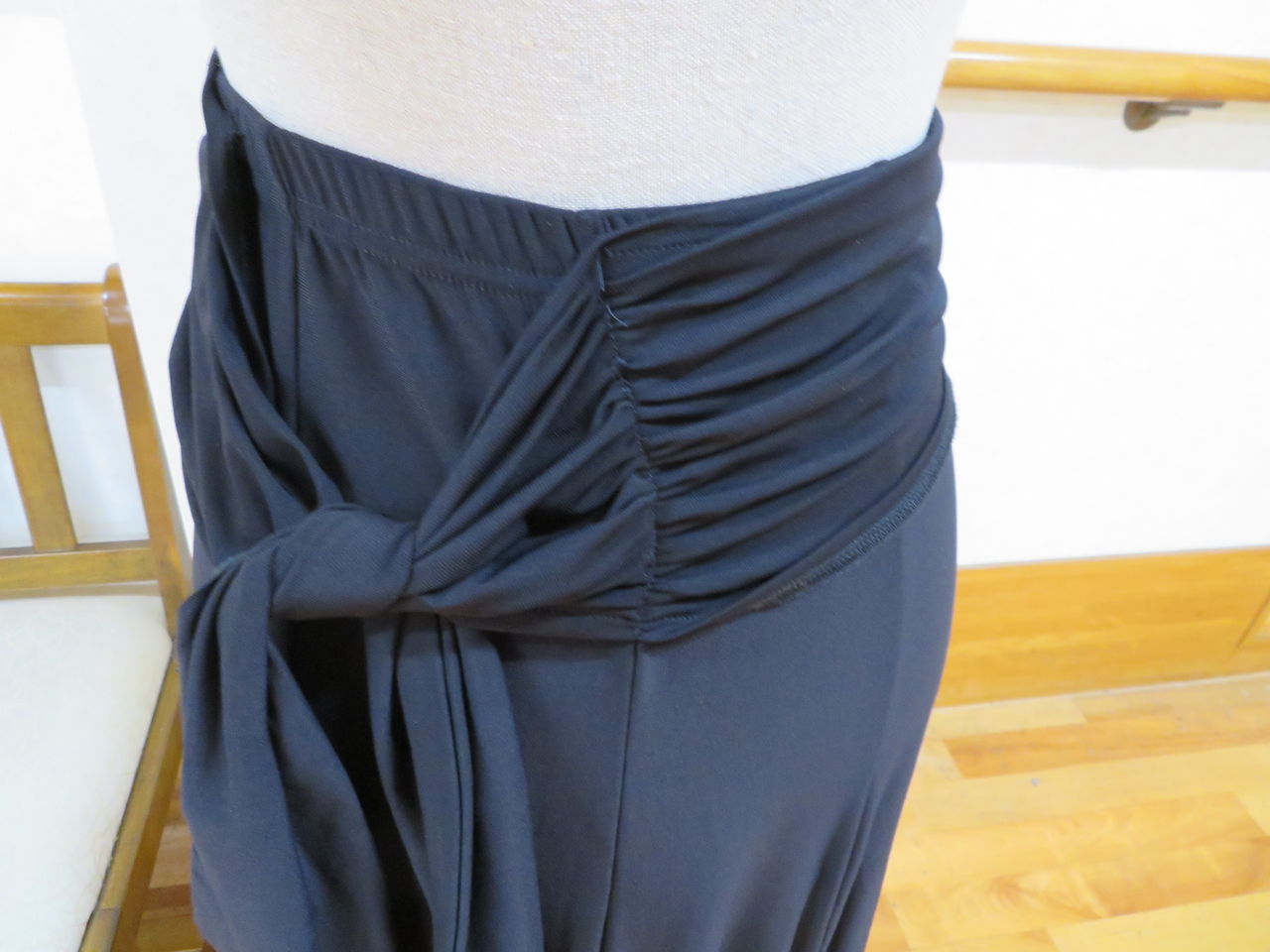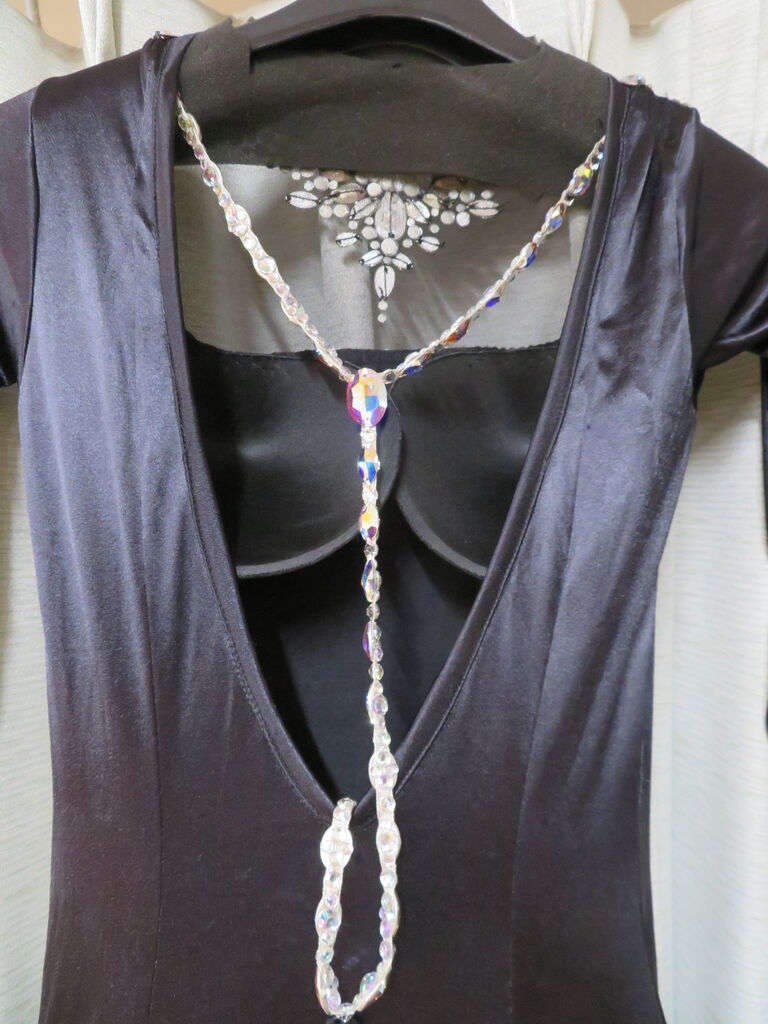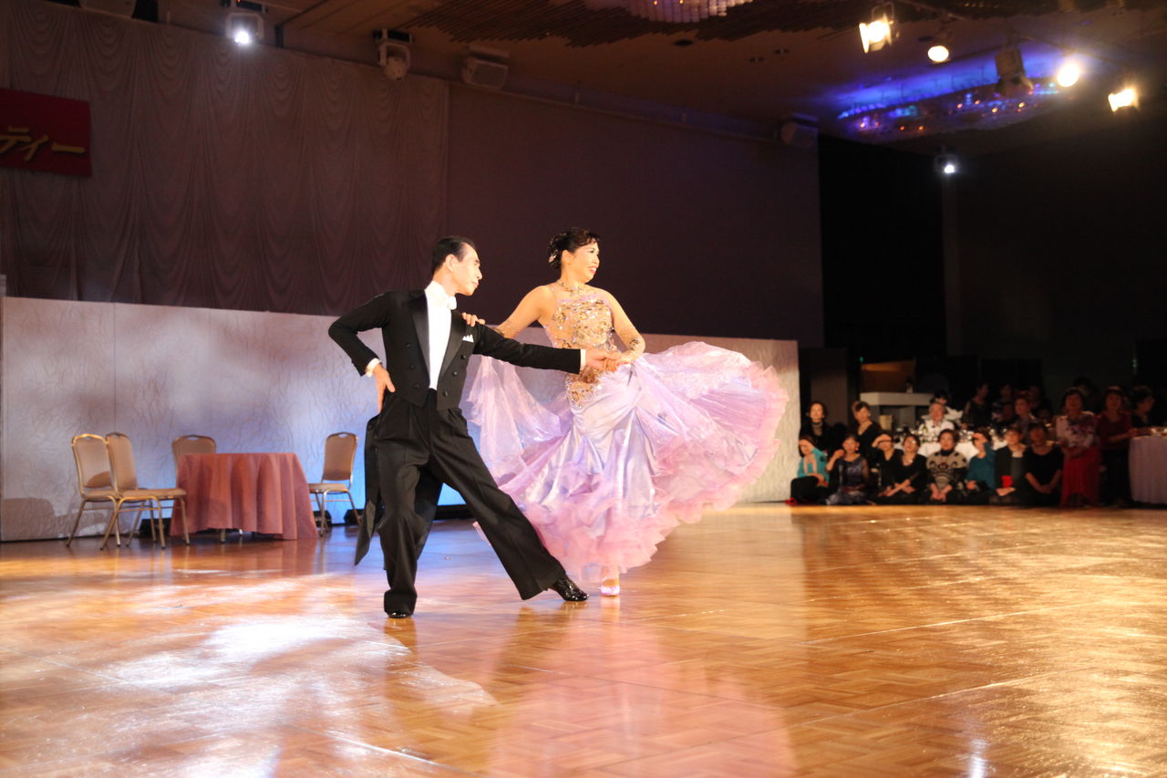 袖は腕が気になる方にも合わせたエレガントな印象のデザインです。上半身はベルベットの生地、スカートはサテンのような光沢の生地。スカートの部分がとてもよく踊ります。