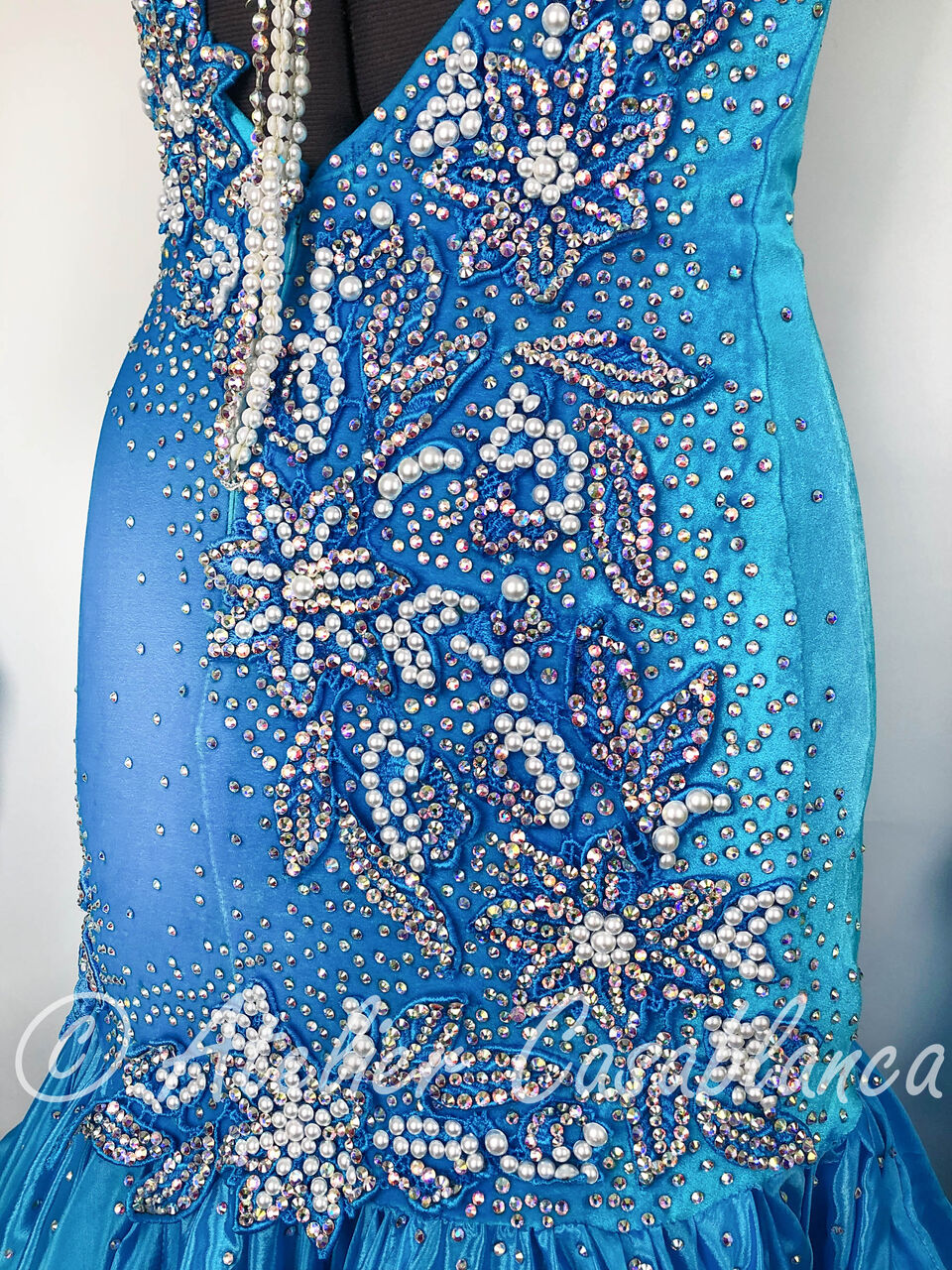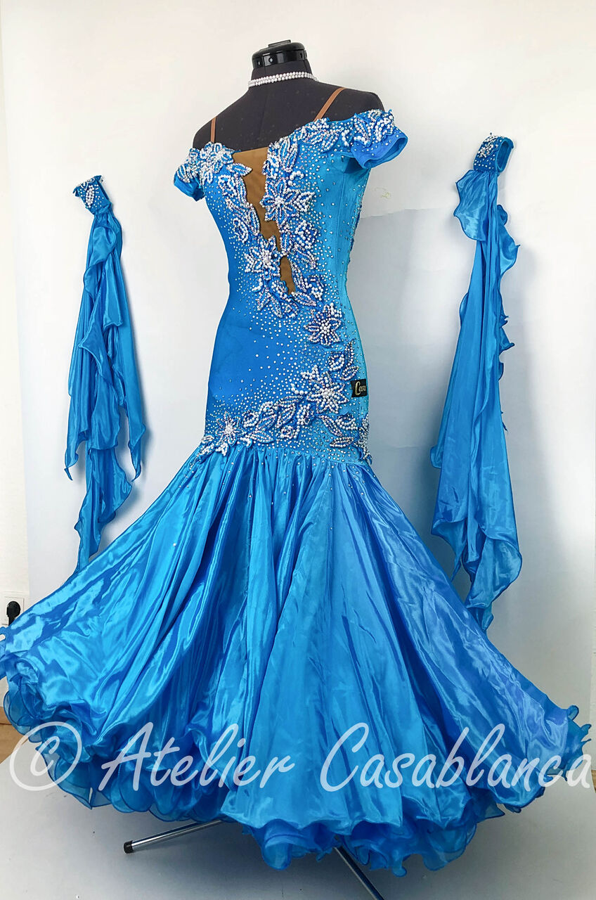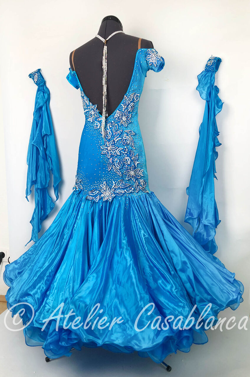 SARA制作の、スワロフスキの石のラインがとてもスタイルよく見せるターコイズブルーのスタンダードドレスです。