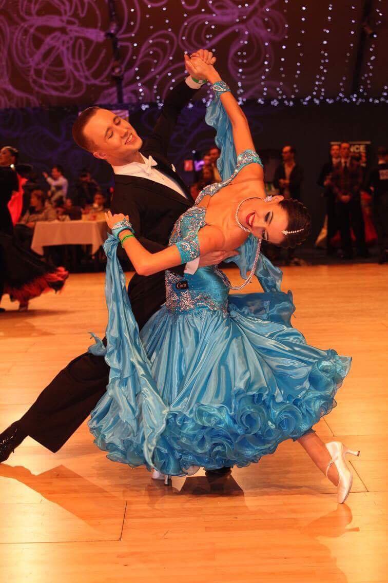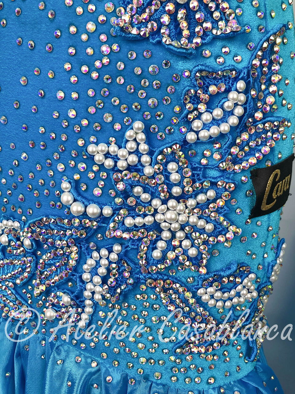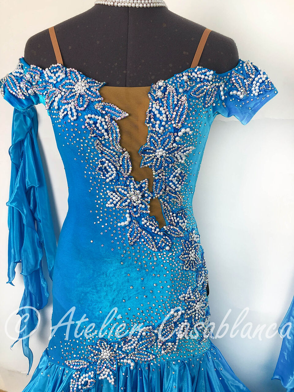 SARA制作の、スワロフスキの石のラインがとてもスタイルよく見せるターコイズブルーのスタンダードドレスです。