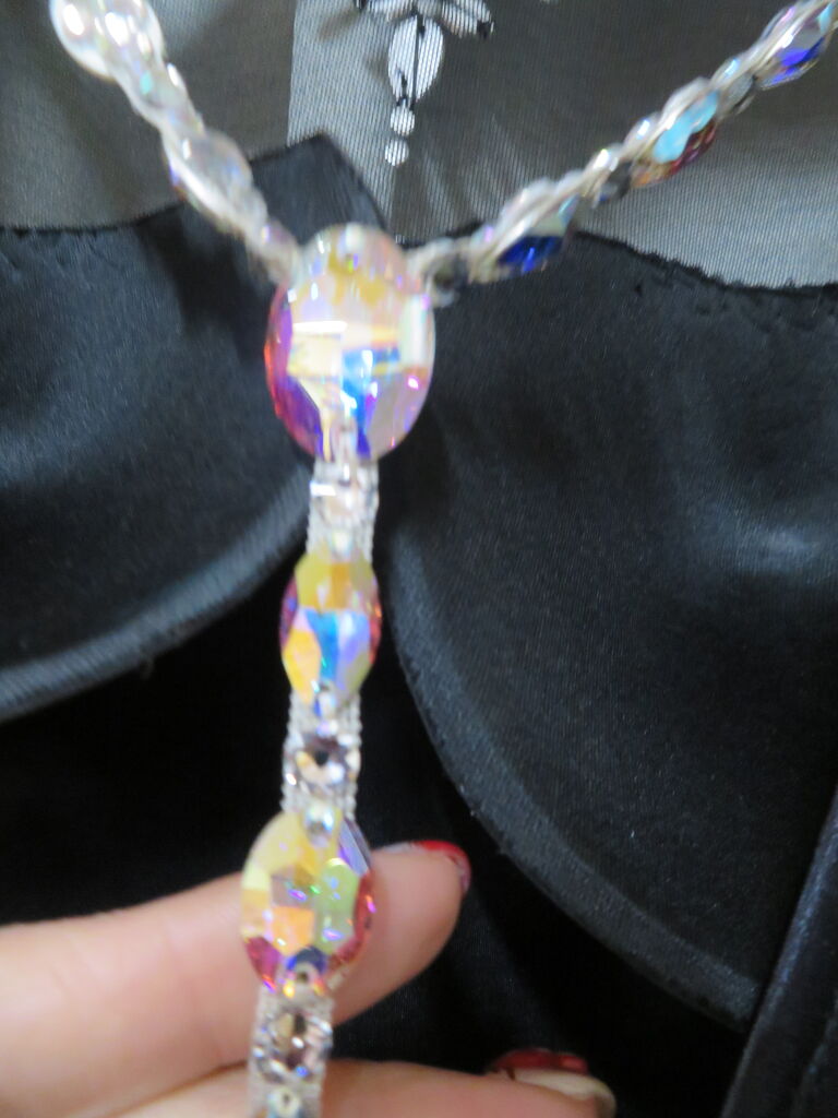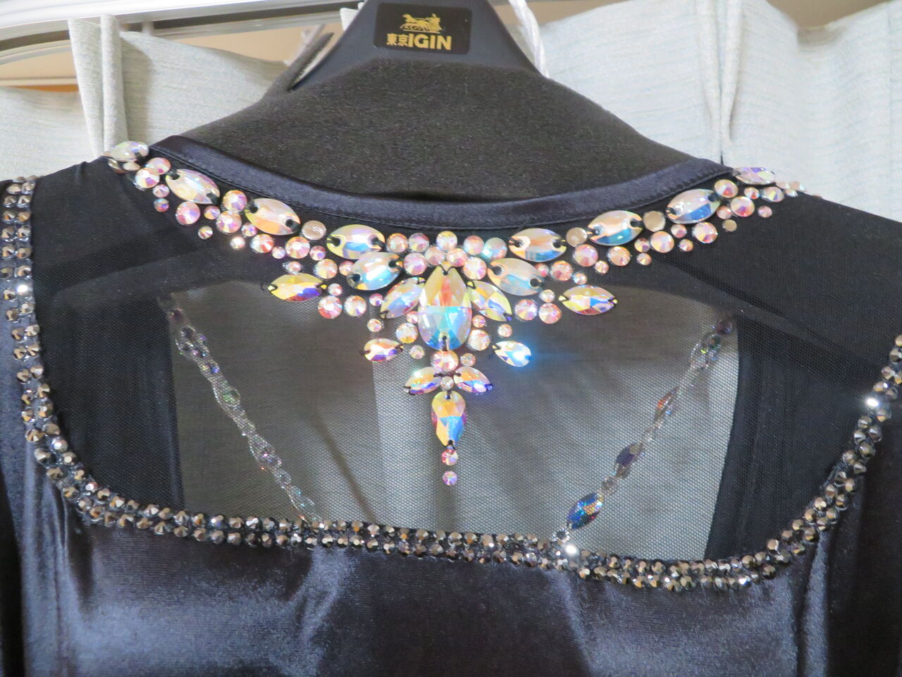 デコルテの大きな石の装飾、パールとスワロフスキの石びっしりの装飾がとても美しく、大変スタイルよく可憐に見せてくれるデザインです。実際にご覧になると、石のラインが光り輝き素晴らしいです。